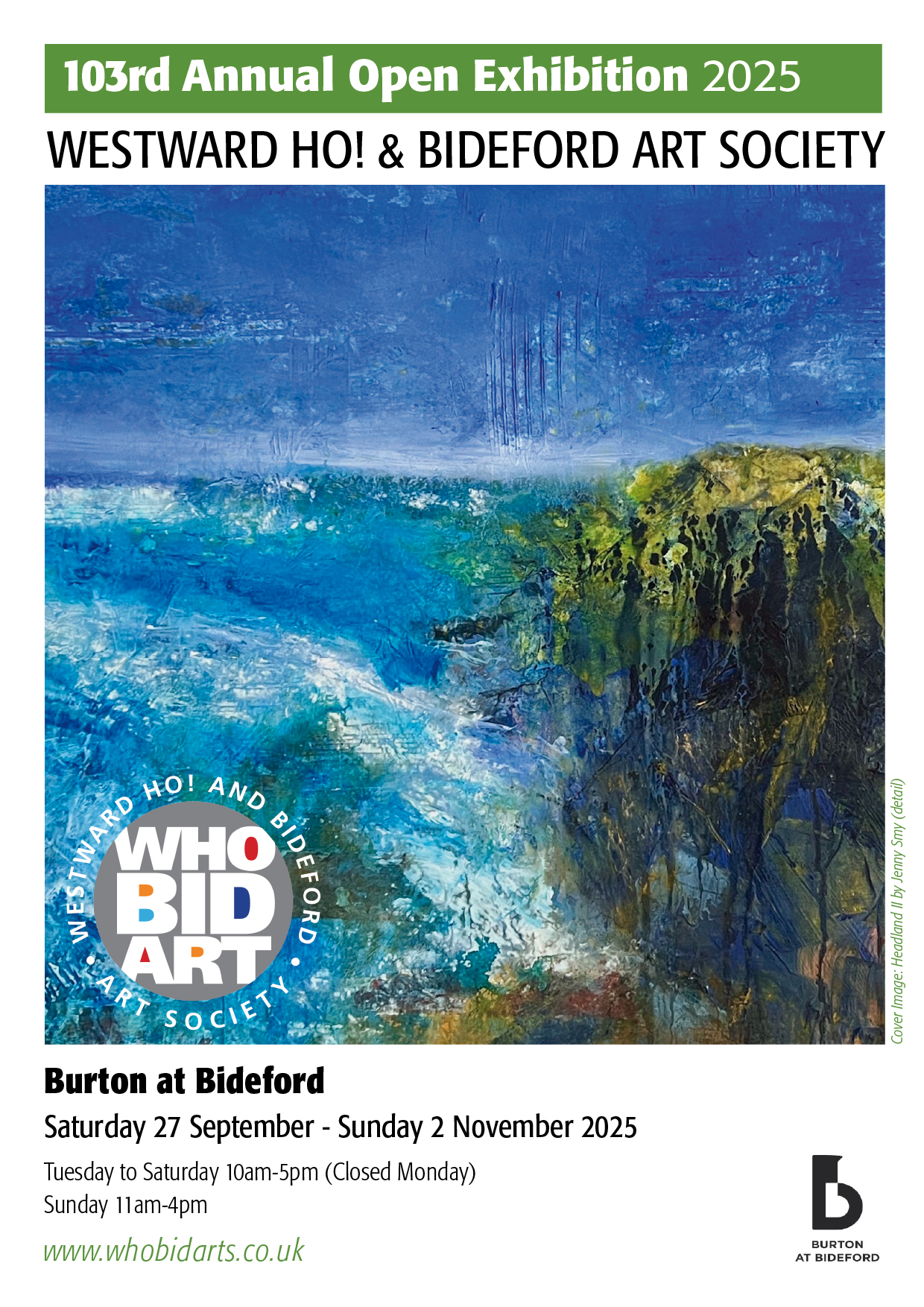 The Westward Ho! and Bideford Art Society (WHOBIDARTS) 2025 exhibition will be held at the Burton Art Gallery & Museum in Bideford, North Devon from Saturday 27 September to Sunday 2 November 2025.